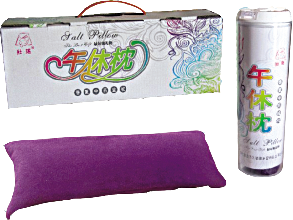 午休枕:本品为半圆柱形,选用青海格尔木优质湖盐盐晶、精选上等薰衣草干花以及多种名贵中草药填充为枕芯。根据人体头颈部的自然生理曲线设计制作具有良好弹性的枕芯,使用时能恰当地托住人体头颈部,以便充分休息及缓解疲劳,并能利用头部自身的重力产生自然牵引的作用,对于预防和辅助治疗颈椎病有积极的效果。
