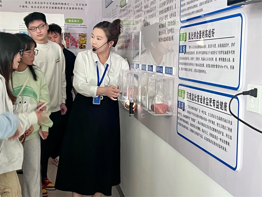最后,南宁分公司工作人员带领大家参观食盐科普驿站,并呈现了一堂有趣的食盐科普课。课程介绍了中国盐业的发展历史、食盐分类、生产工艺流程,以及食盐加碘、盐品选购等专业知识。现场展示了如何辨别合格食盐,提示食盐相关误区,以及食盐在日常生活中的巧妙运用等实用信息。课堂妙趣横生、通俗易懂,大家听得津津有味,与工作人员积极互动,现场氛围十分活跃。