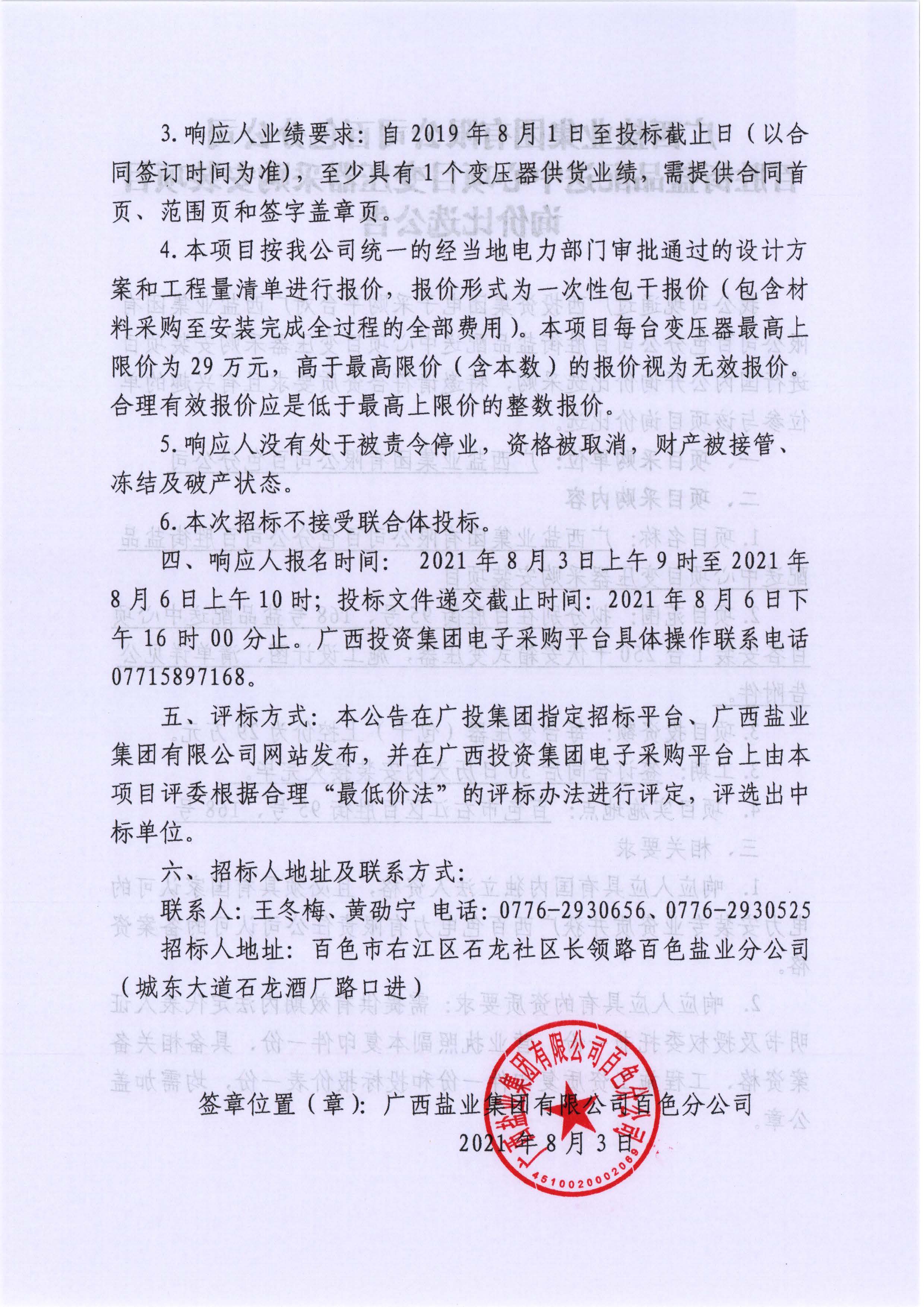 正规滚球app平台百色分公司百胜街盐品配送中心项目变压器采购安装项目询价比选公告